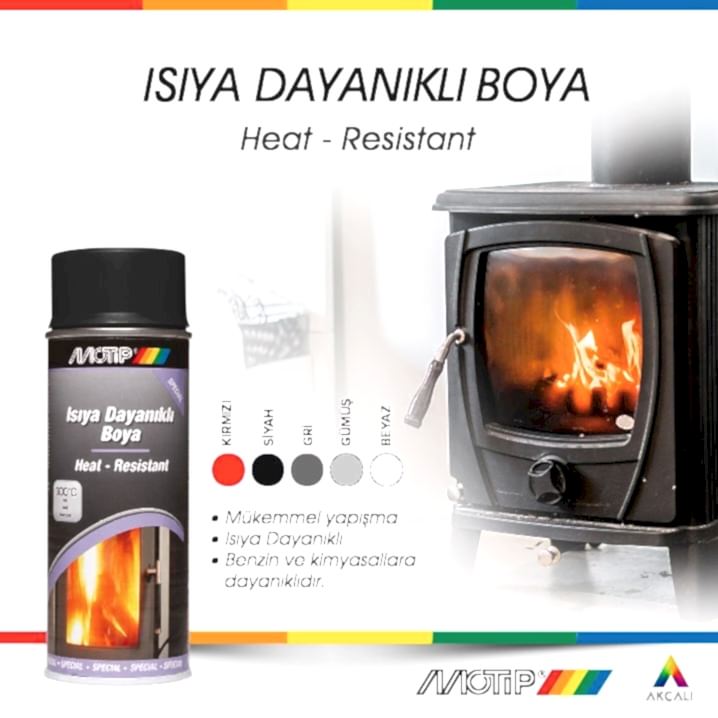 · Motip ısıya dayanıklı boya, ısıya maruz kalan mangal,soba borusu,egzost vs. gibi objelerin tadilat ve rütuşunda kullanılır.